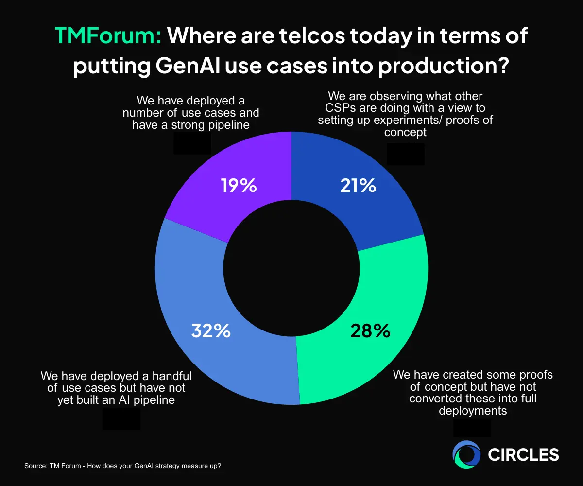 In 2024, TM Forum’s GenAI Maturity Interactive Tool (GAMIT) report highlighted that many telcos were still in the proof of concept phase when it came to Generative AI adoption.1