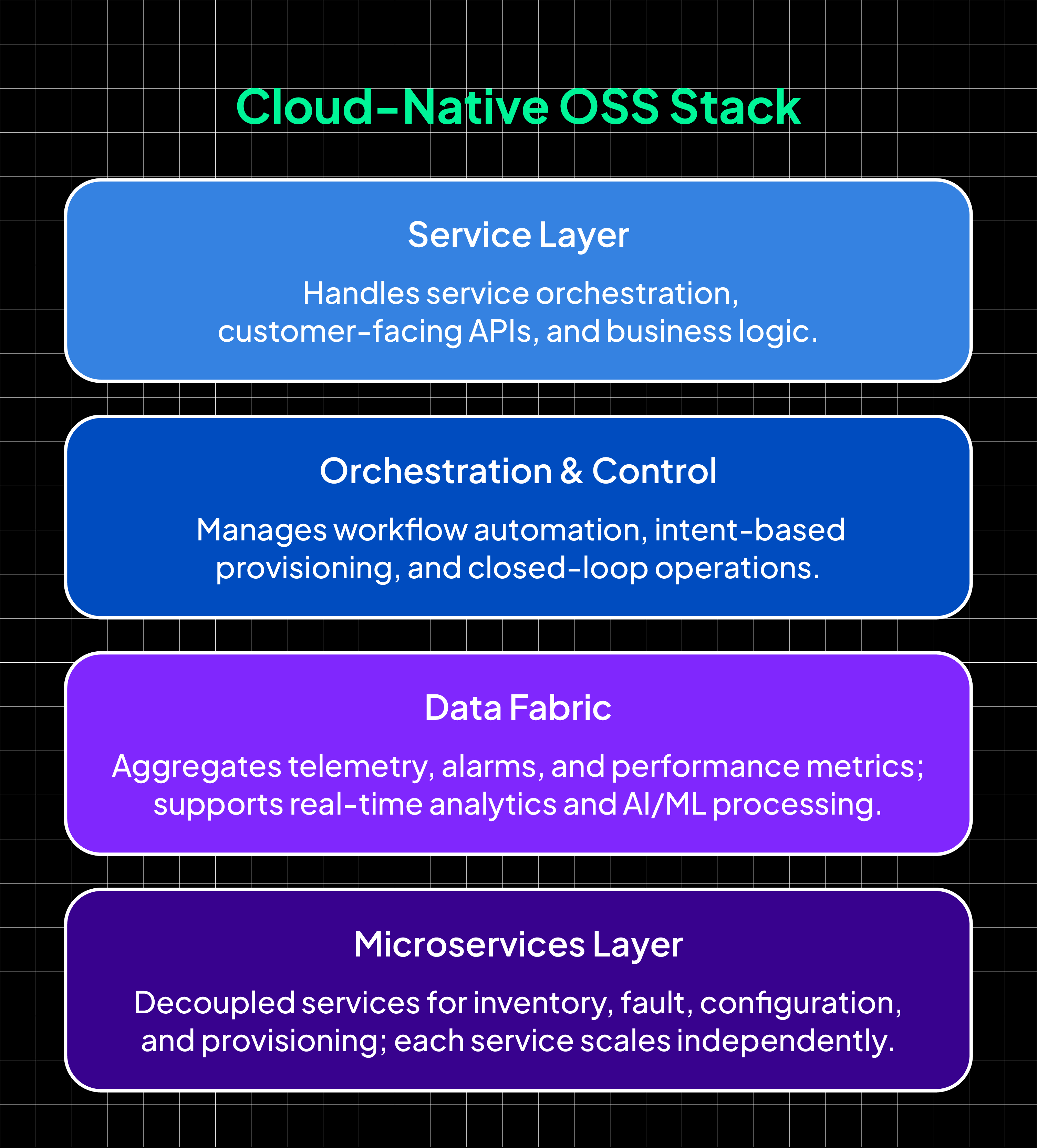 Operators now manage hybrid, multi vendor environments that include 5G, IoT deployments, fiber, and virtualized RAN components. Traditional OSS were designed for static hardware centric networks and offer limited cross domain visibility. They struggle to ingest real time telemetry or to coordinate distributed control for software defined network functions. Modern OSS modernization introduces systems that are modular and cloud native, supporting streaming telemetry, policy driven control, and dynamic network functions. That capability is essential to monitor and optimize service health across physical and virtual layers in real time.